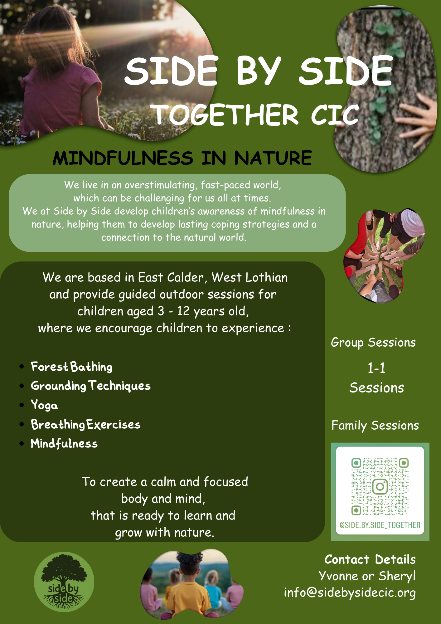 We have created Side by Side Together CIC as a nurturing space for children and families to experience mindful, nature-led sessions that support emotional growth, resilience, and joy.